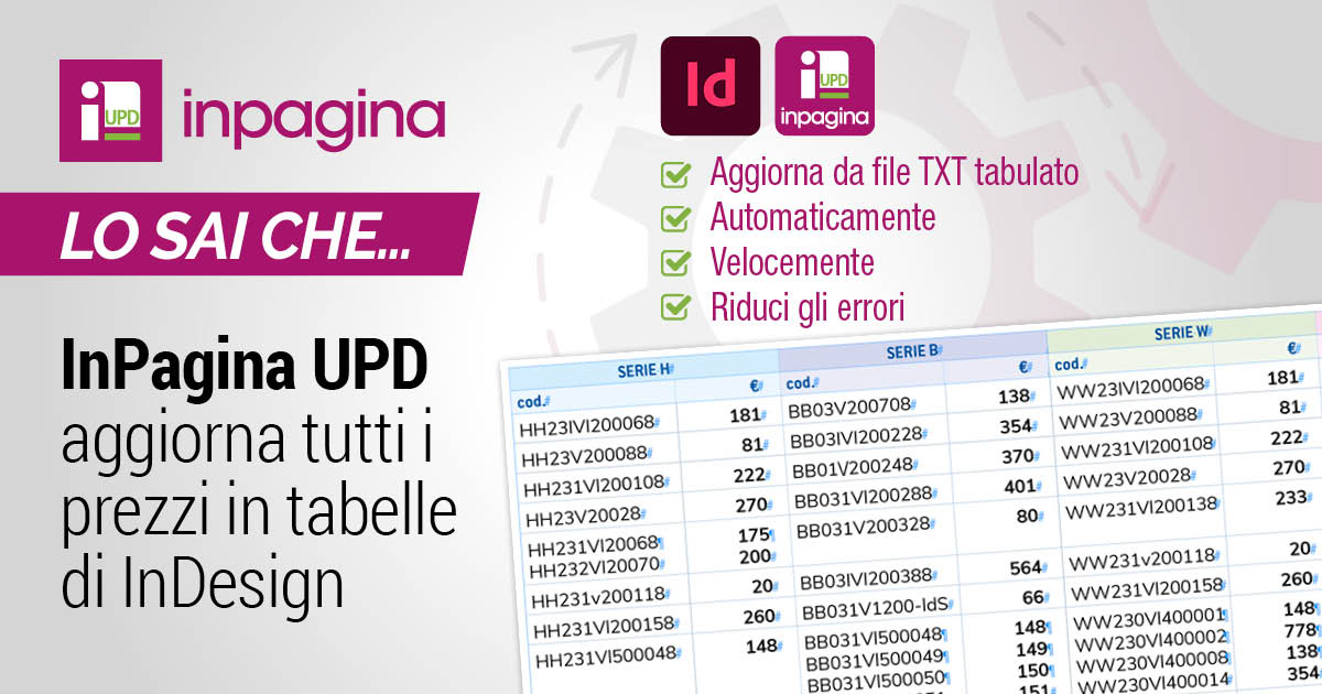 InPagina UPD è un plug-in per InDesign che permette di aggiornare velocemente i prezzi nelle tabelle di un impaginato, individuando automaticamente i prezzi tramite il codice del prodotto e lo stile paragrafo e/o carattere applicato.