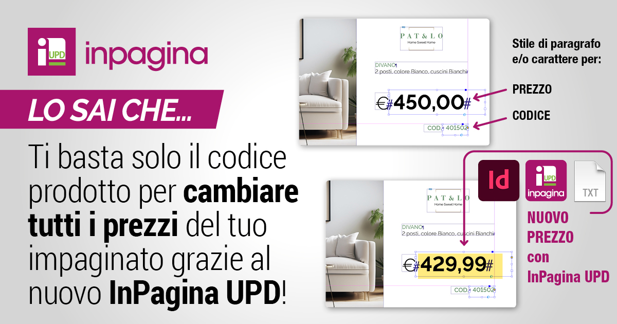 🎉 🎀 InPagina UPD è una nuova versione di InPagina che permette di cambiare o ricalcolare tutti i prezzi in un impaginato individuando automaticamente i prezzi tramite il codice del prodotto e lo stile paragrafo e/o carattere applicato.