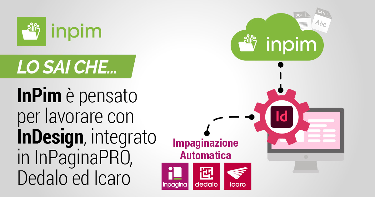 🤝 InPim si integra con InDesign e comunica (andata e ritorno) con i programmi di impaginazione automatica InPaginaPRO, Dedalo e Icaro per gestire tutti i prodotti senza errori.